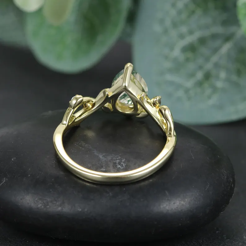 Pear cut moss agate Engagement Ring,14K Yellow Gold Wedding Ring,natural Moss Agate Gemstone Ring, Anniversary Gift for Her