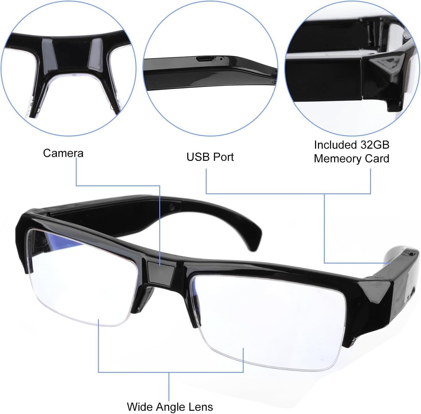 - Included 32GB Memory Card: The camera glasses come with a 32GB memory card that automatically overwrites the oldest, allowing for hassle-free storage. Easily transfer your to a PC using the included data cable