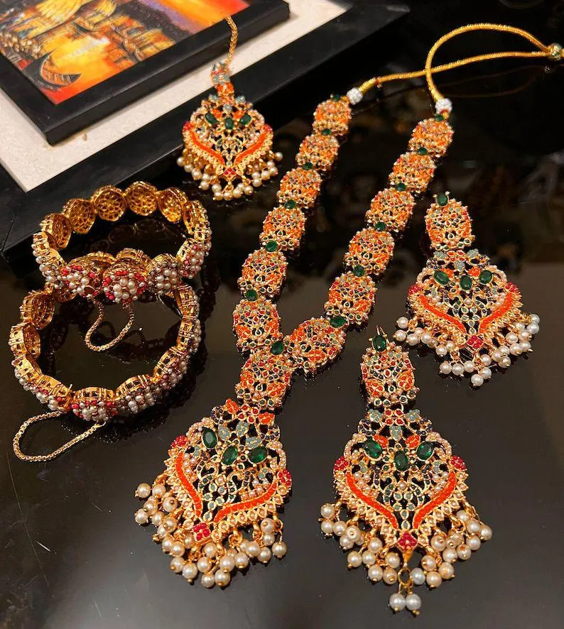 Elevate your traditional look with this breathtaking handcrafted bridal jewelry set, featuring an intricately designed necklace, matching statement earrings, Maang Tikka and decorated bangles. Adorned with pearl drops, colorful gemstones, and detailed gold-toned filigree work, this set brings a royal touch to any celebration.