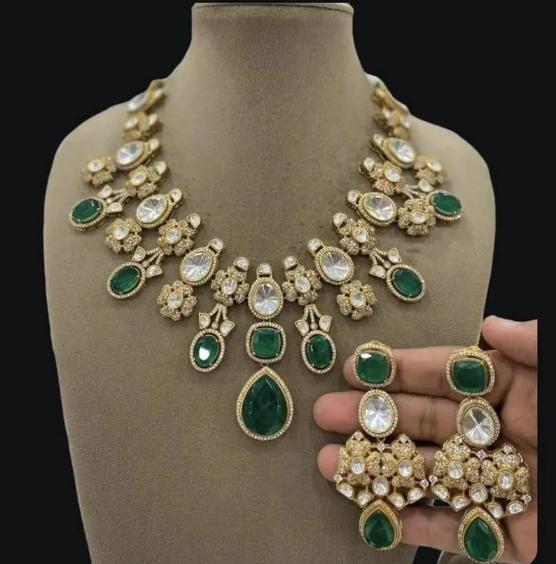 Stunning and gorgeous, Uncut Moissanite Polki studded very fine quality Sabyasachi necklace with matching earrings in popular emerald green color
