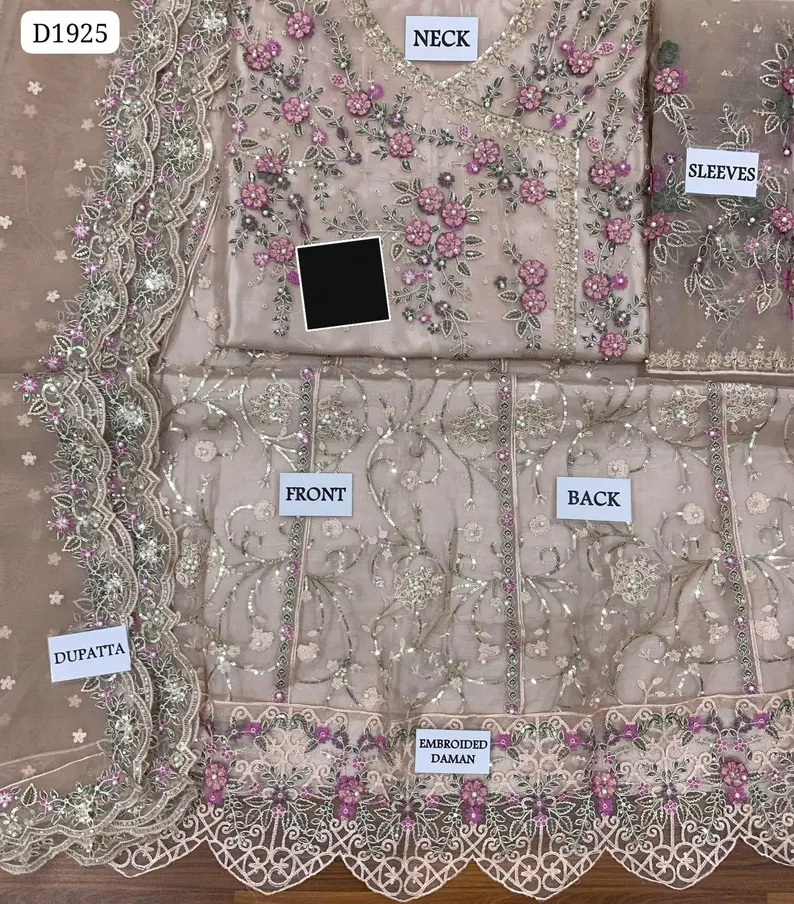 Sequence Embroidered Sleeves On organza and 3D flowers work With punch balls work and Ada work