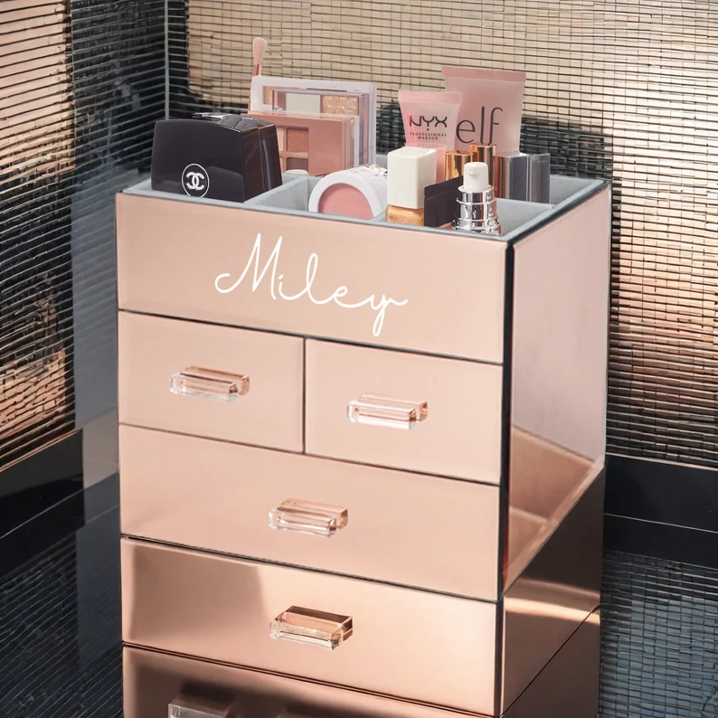 Personalized Handmade Mirror Cosmetic Organizer – 3 Drawer Mirrored Bathroom Vanity Desktop Jewelry Makeup Storage Bin – Rose Gold or Silver