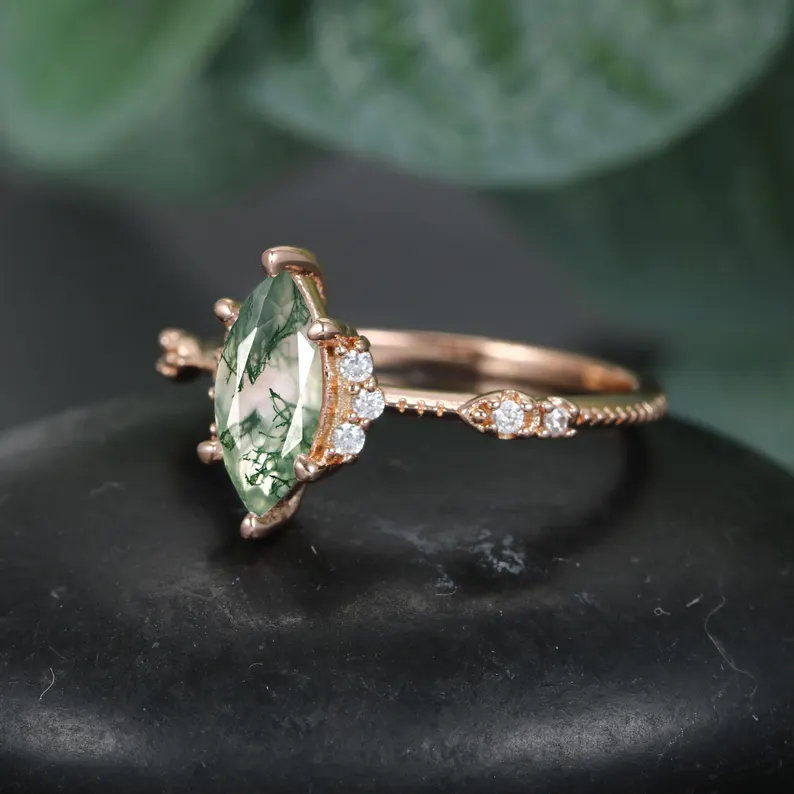 Choosing a moss agate engagement ring celebrates nature’s artistry. Its delicate green veils, like a living landscape painting, form a one-of-a-kind masterpiece forged over millions of years – mirroring your unique bond. The stone’s serene glow and organic elegance embody timeless love, thriving beyond trends. A whisper of eternity, cradled in stone.