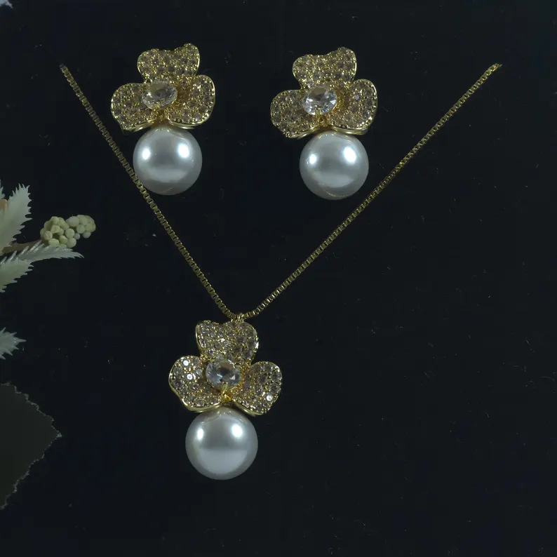 This jewelry set features a beautifully detailed three-petal floral design, encrusted with shimmering stones that add a subtle sparkle. Each floral piece is complemented by a luminous pearl drop, symbolizing purity and refinement. The meticulous detailing ensures a luxurious look, making this set an essential addition to any jewelry collection.