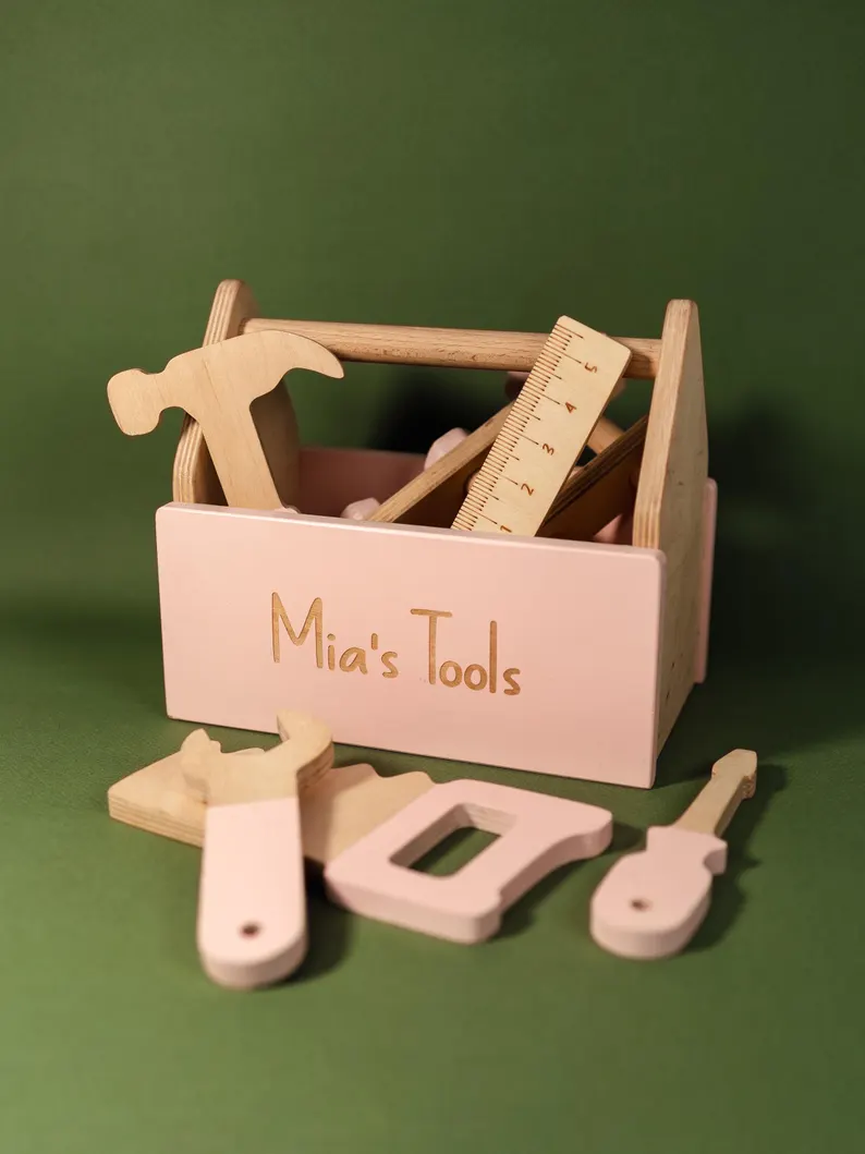 This set includes: 1 hammer, 1 screwdriver, 1 wrench, 1 ruler, 1 hand saw, 3 screws, 6 nuts + mini geoboard for an extra fee. Please be informed that if you choose a wood color, the name of your child will be printed in white, not engraved.